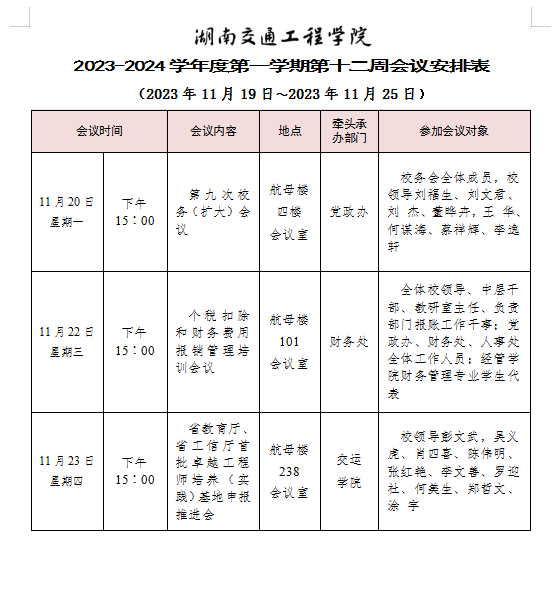 新葡萄8883官网AMG官网 2023-2024学年度第一学期第十一周会议安排表