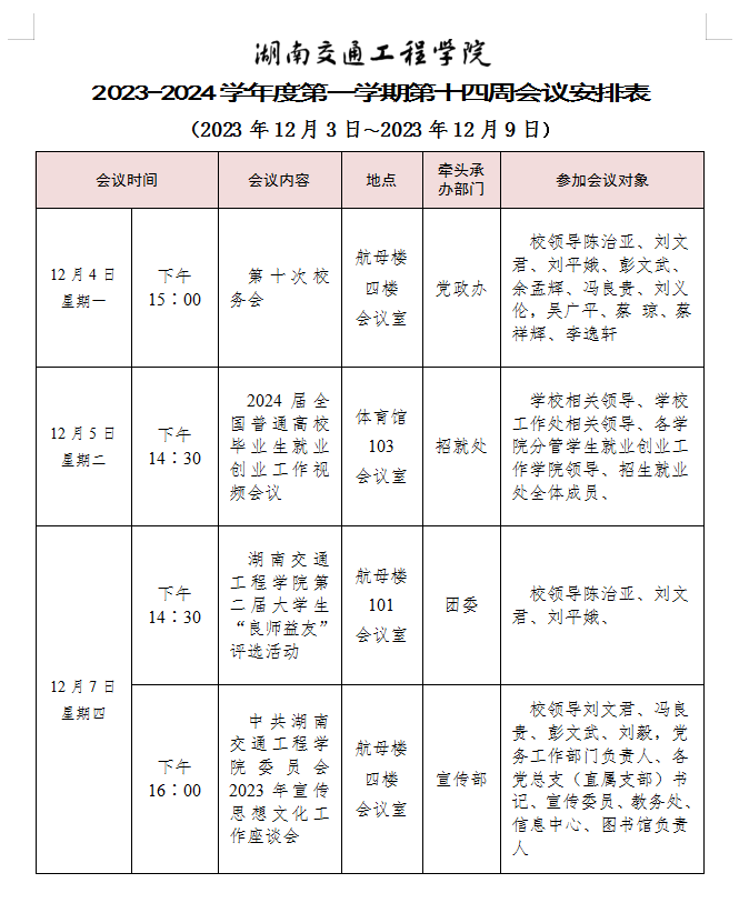 新葡萄8883官网AMG官网 2023-2024学年度第一学期第十四周会议安排表