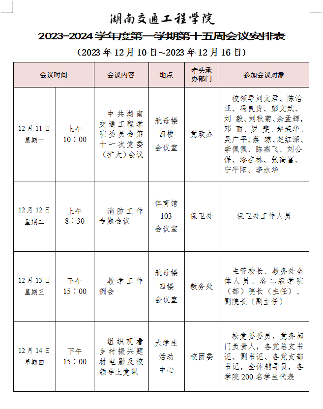 新葡萄8883官网AMG官网 2023-2024学年度第一学期第十五周会议安排表