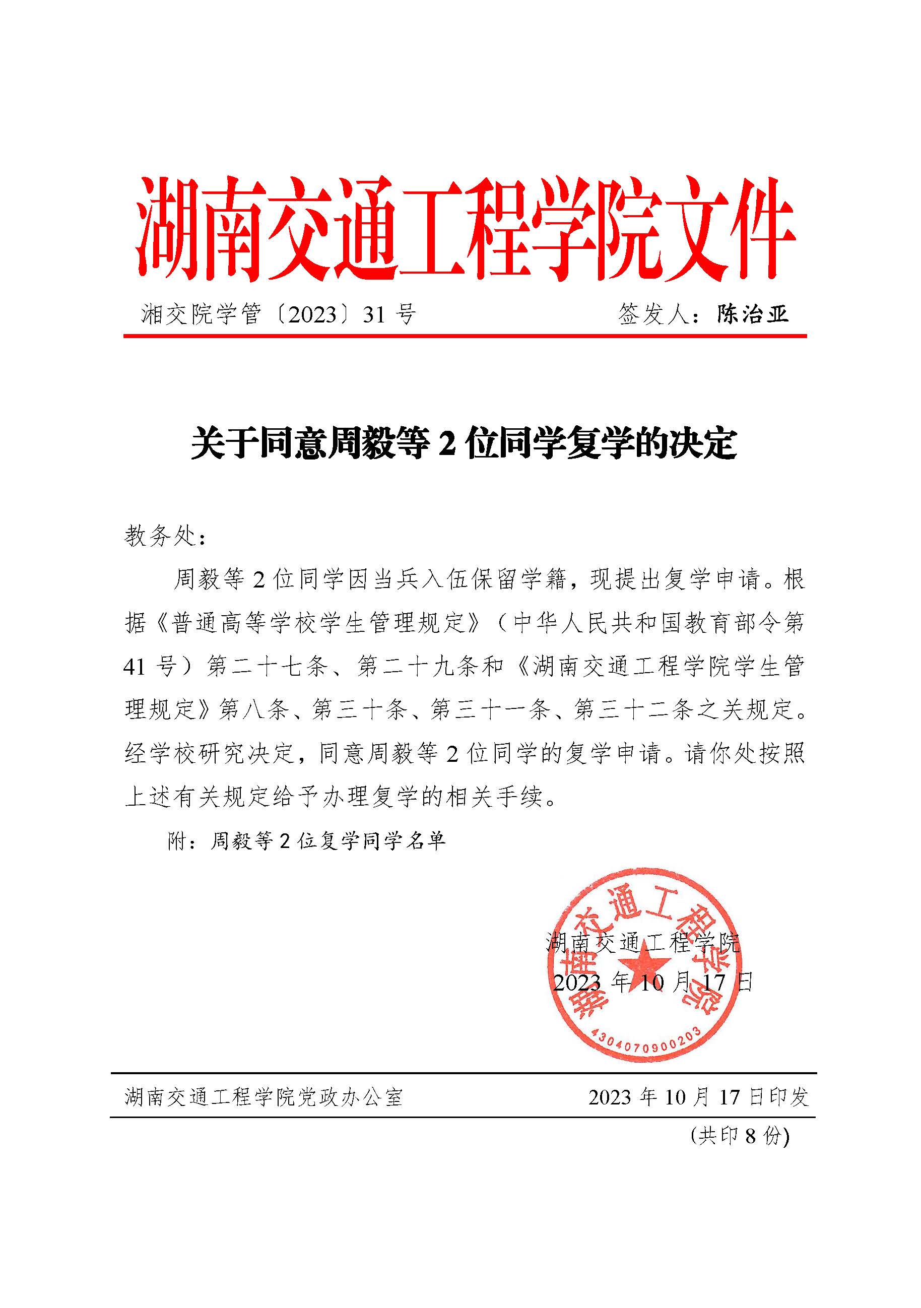 关于同意周毅等2位同学复学的决定(湘交院学管〔2023〕31号)