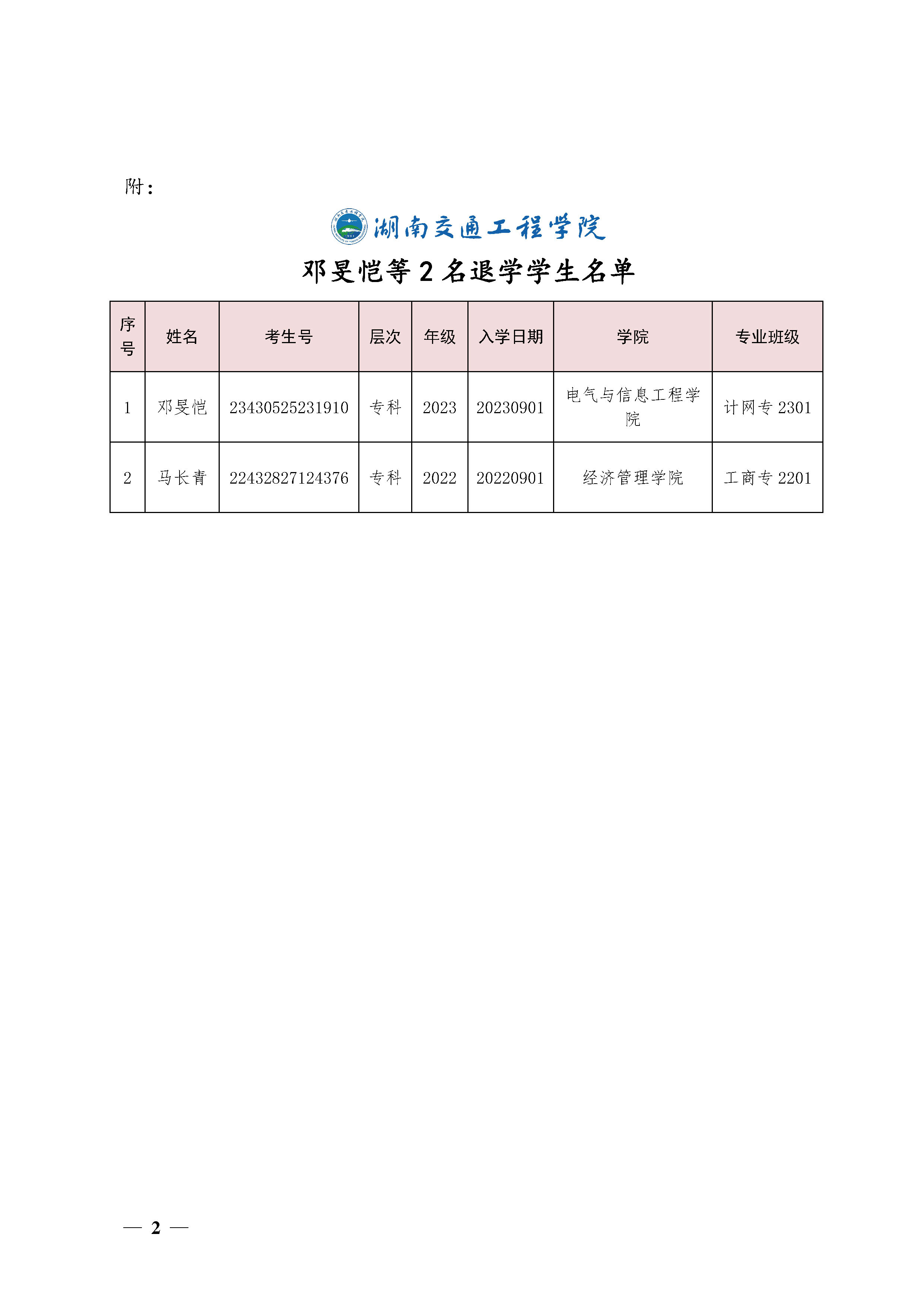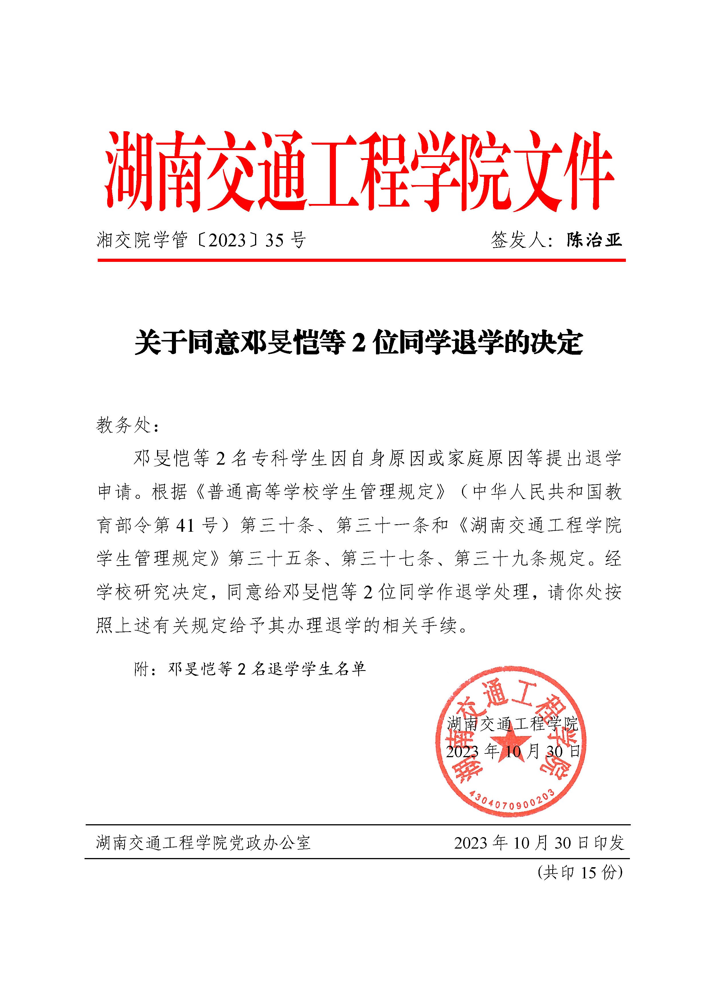 关于同邓旻恺等2位同学退学的决定(湘交院学管〔2023〕35号)