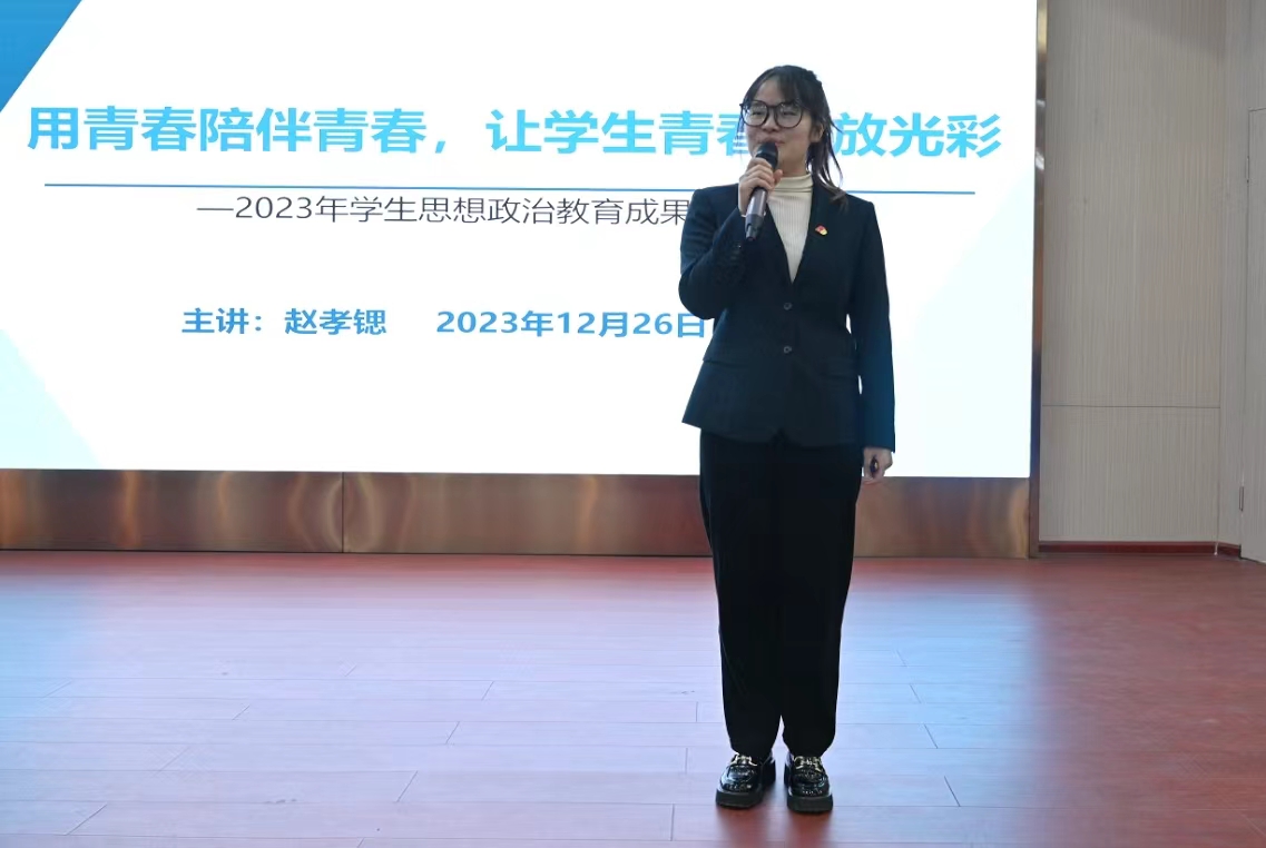 经济管理学院辅导员赵孝锶作为年2023年年度辅导员代表,她以《用青春陪伴青春,让学生青春绽放光彩——2023年学生思想政治教育成果汇报》为题作了先进事迹报告。