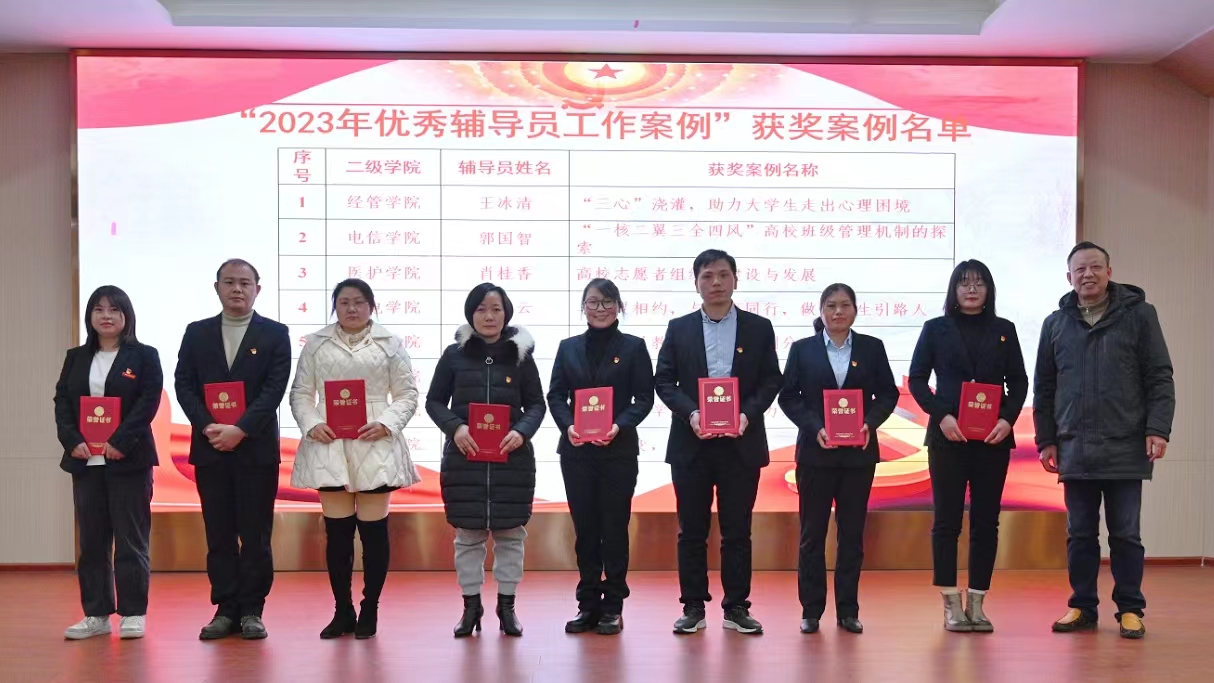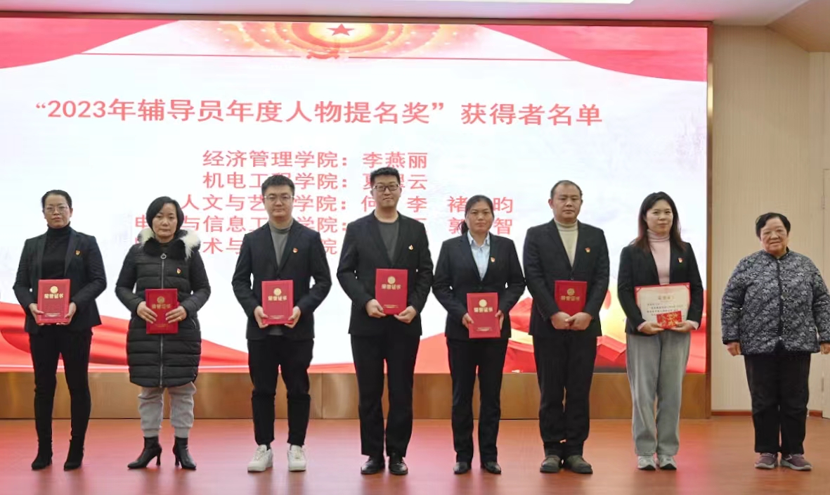 科技处处长吴义虎为王冰清等8篇优秀辅导员工作案例获得颁奖,刘平娥为刘晓珍等7名2023年辅导员年度人物提名奖获得者颁奖,刘文君为赵孝锶等8名2023年辅导员年度人物颁奖。