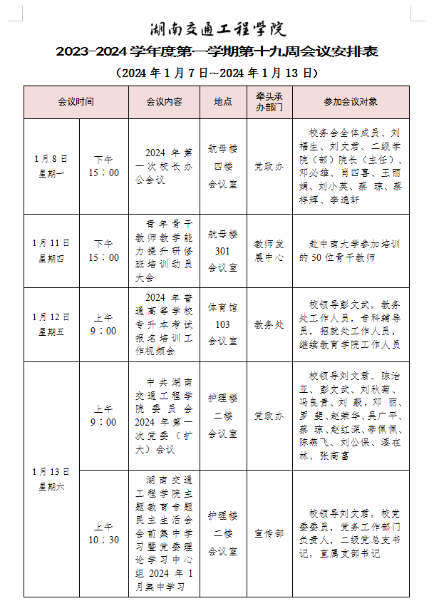 新葡萄8883官网AMG官网2023-2024学年度第一学期第十九周会议安排表