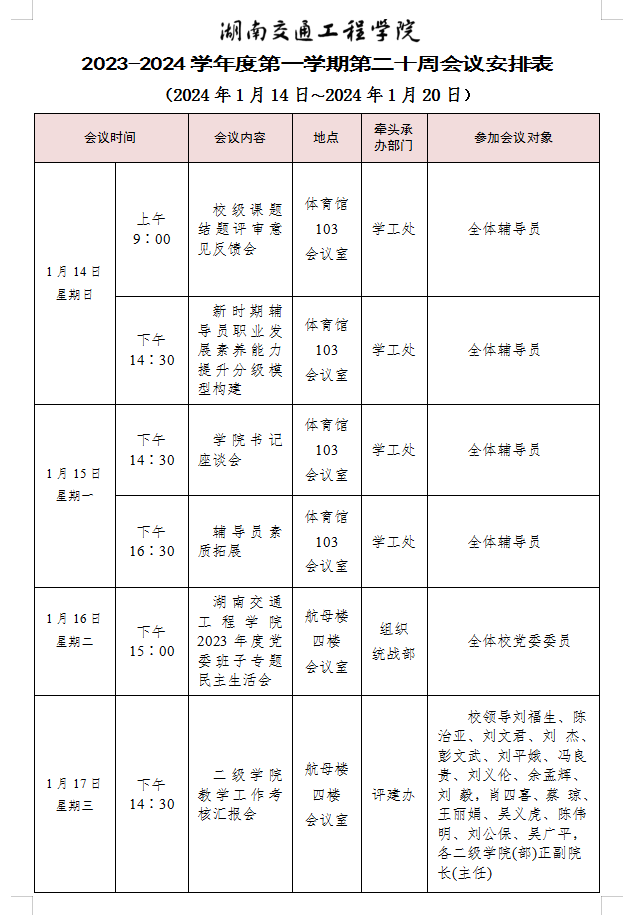 新葡萄8883官网AMG官网2023-2024学年度第一学期第二十周会议安排表