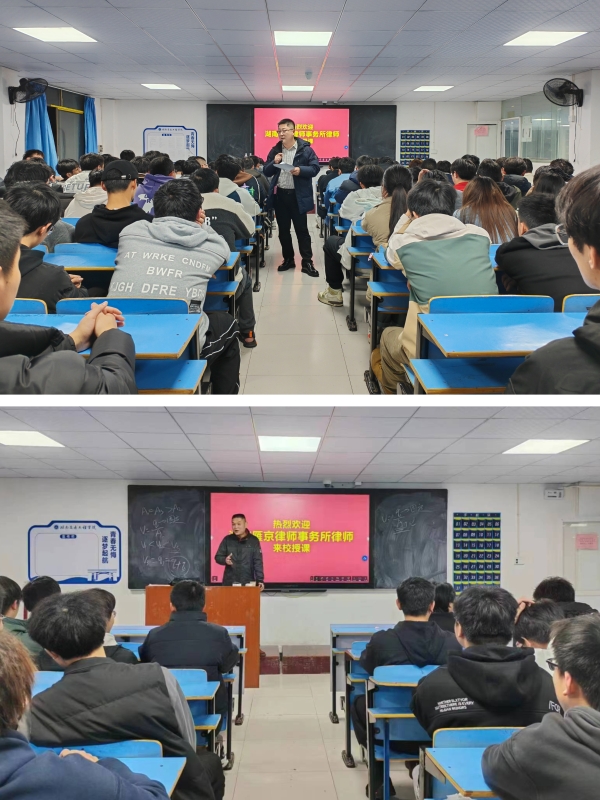 本网讯(通讯员 凌芳)为了进一步加强校园法治教育,增强学生的自我保护意识,提高学生的自我防范能力,有力推动学校法治校园、平安校园建设,3月13日晚,机电工程学院特邀请湖南雁京律师事务所党支部书记王宏,携手律所刑辩律师黄贵荣副主任,带领律所青年律师来校为大一,大二机制专业的学生开展一场校园安全法治主题讲座。
