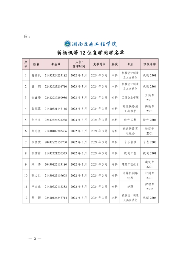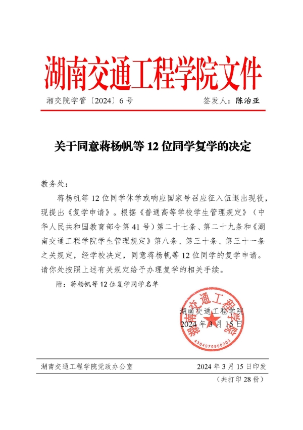 关于同意蒋杨帆等12位同学复学的决定(湘交院学管〔2024〕6号)