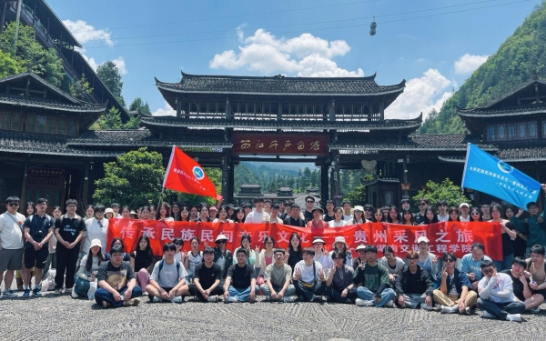 ▲师生在西江千户苗寨寨门前集体合影