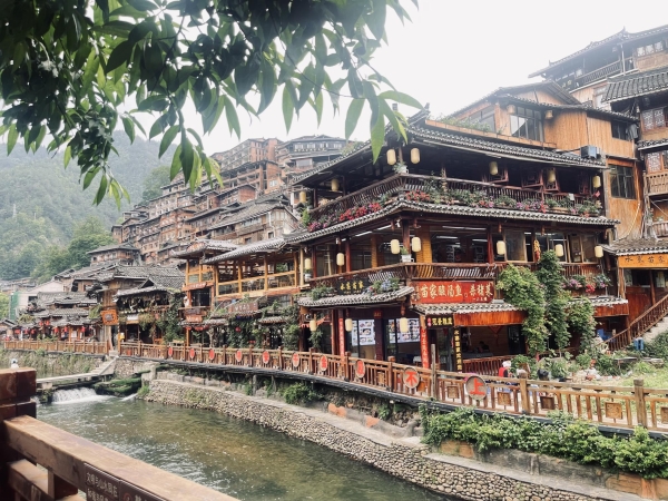 师生们走进西江千户苗寨,顿时被在半山建造的独具特色的木结构吊脚楼所震撼,千余户吊脚楼随着地形的起伏变化,层峦叠嶂。西江千户苗寨的吊脚楼为穿斗式歇山顶结构,源于上古南方居民的干栏式建筑,与周围的青山绿水和田园风光融为一体,和谐统一,相得益彰,是中华上古居民建筑的活化石,在建筑学等方面具有极高的美学价值。