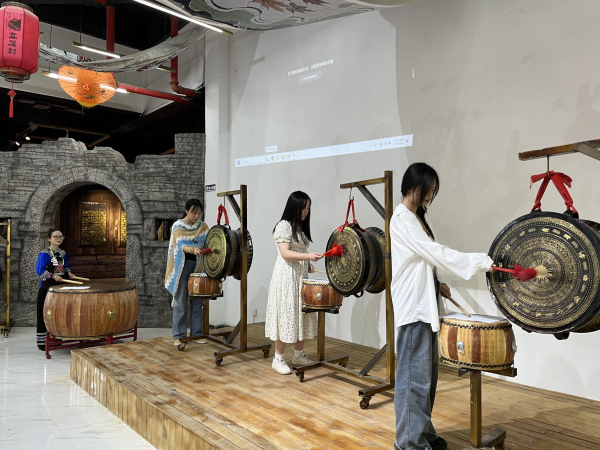 在高荡村布依族民俗陈列馆,师生们聆听了布依族民间艺人关于布依族歌舞艺术的介绍、现场学习了演奏布依族民族古老的打击乐器铜鼓。