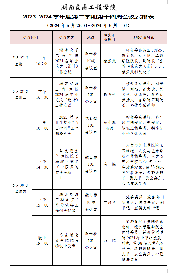 新葡萄8883官网AMG官网2023-2024学年度第二学期第十四周会议安排表