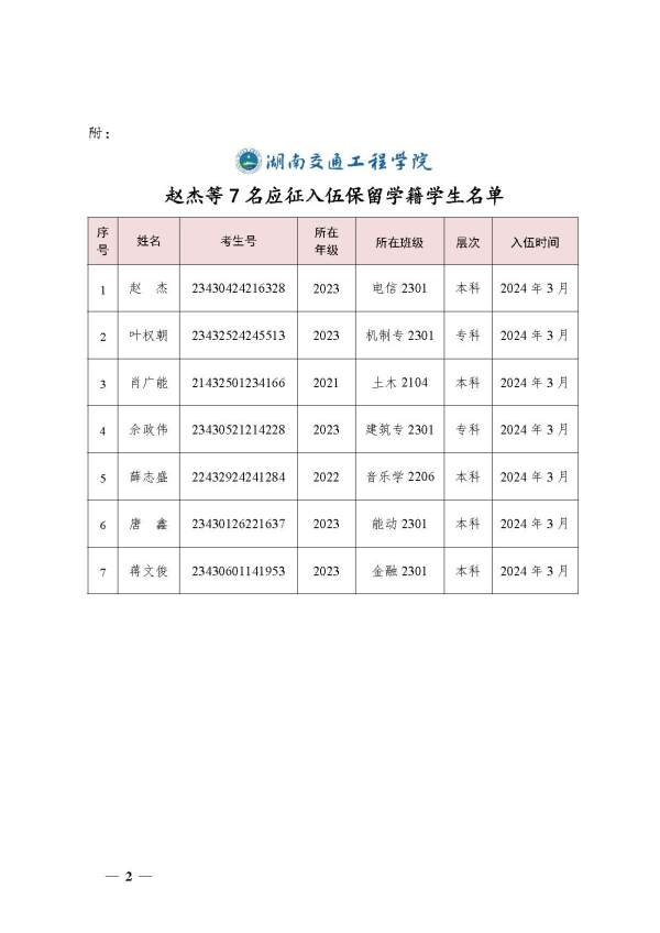 关于同意赵杰等7名同学保留学籍的决定(湘交院学管〔2024〕14号)