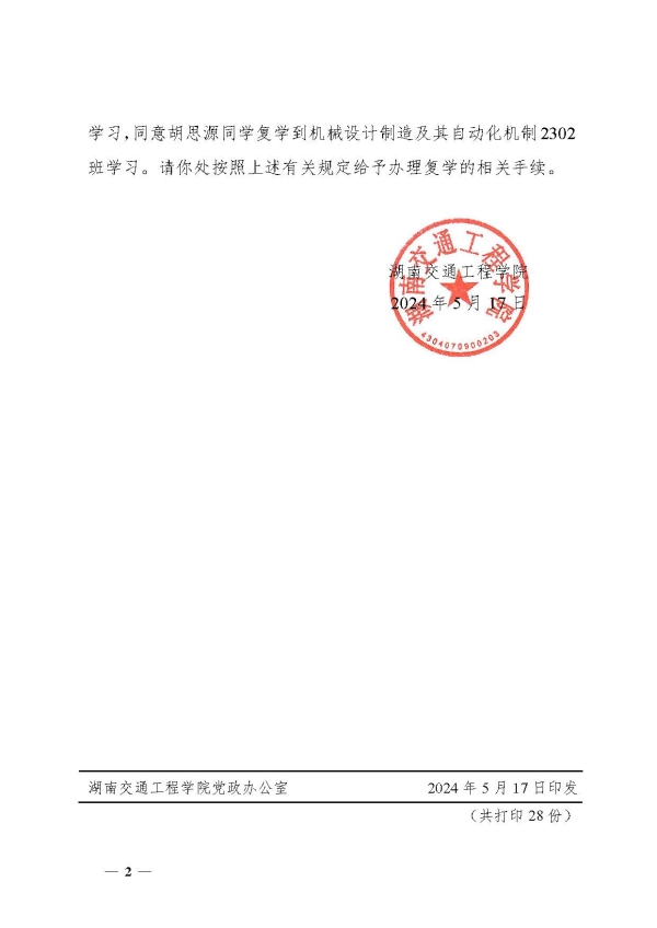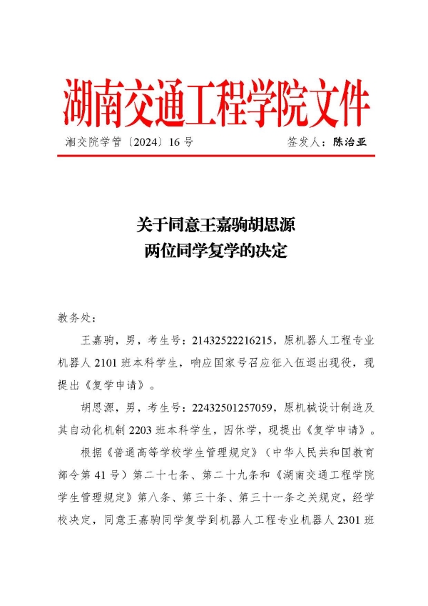 关于同意王嘉驹胡思源同学复学的决定(湘交院学管〔2024〕16号)