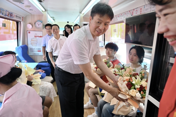 在毛泽东铜像文化广场,谢宏与献血登记学生和宣传工作人员一一握手,询问他们的身体状况,赞赏他们用实际行动展现了当代大学生有情有义、无私奉献的精神,体现了青年学生积极担当、引领社会文明风尚的责任与使命。随后,谢宏详细了解了献血的各项流程与具体安排,对志愿者细致热情的服务、医护人员耐心严谨的工作表示感谢。对立体化献血宣传,他表示这种科普方式,一定会使广大市民对无偿献血和用血安全有更直观的认识和全面了解,消除市民对无偿献血的误解和顾虑。