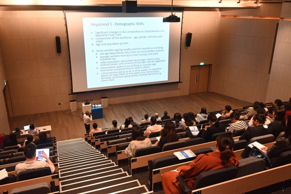 陈志明教授从业务、经济、行业、社会和个人等五个方面解读“什么是大趋势”进行开讲,以“为什么要研究大趋势”为切入点,详细阐述了全球变化的大趋势:气候变化、技术扰乱、人口结构转变、世界分裂和社会动荡。