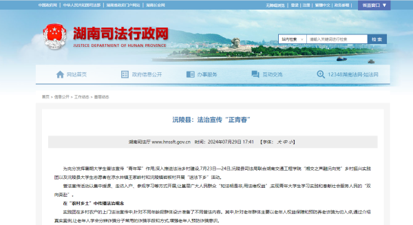 湖南省司法厅官网首页“基层动态”栏目以《沅陵县:法治宣传“正青春”》为题,报道新葡萄“湘交之声,融沅向党”乡村振兴实践团参与2024年全国大学生“送法下乡”活动。