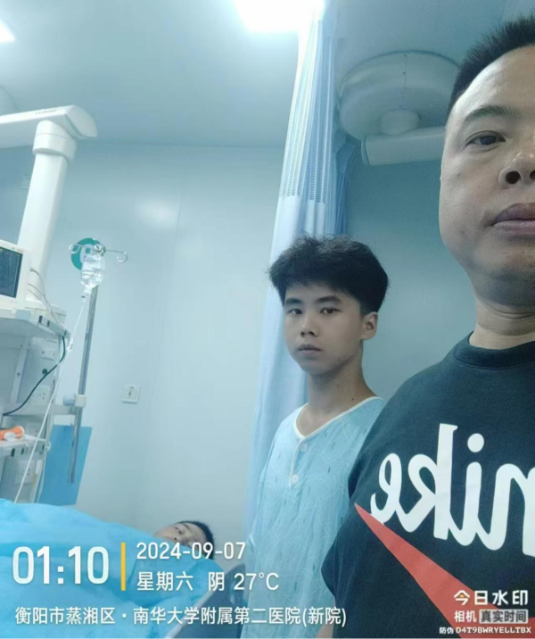 在同学叶轩丞、刘涛、肖明同学热心帮助下,张尹超同学迅速被送往南华附二医院急救室抢救,刘建军老师和三名同学在急救室内陪护了整整一夜,没有休息。由于开学以来的持续高温,医护学院的各位领导及老师高度重视学生身体健康,时刻关注学生身体情况,为每一位新生的身心健康保驾护航。