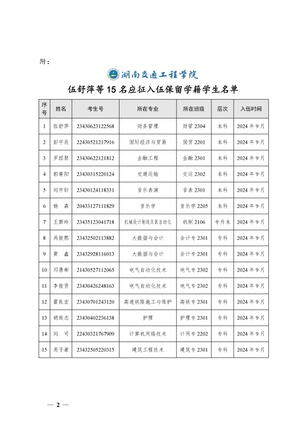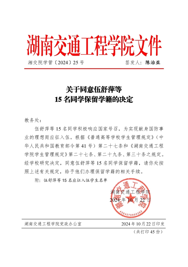 关于同意伍舒萍等15名同学保留学籍的决定(湘交院学管〔2024〕25号)