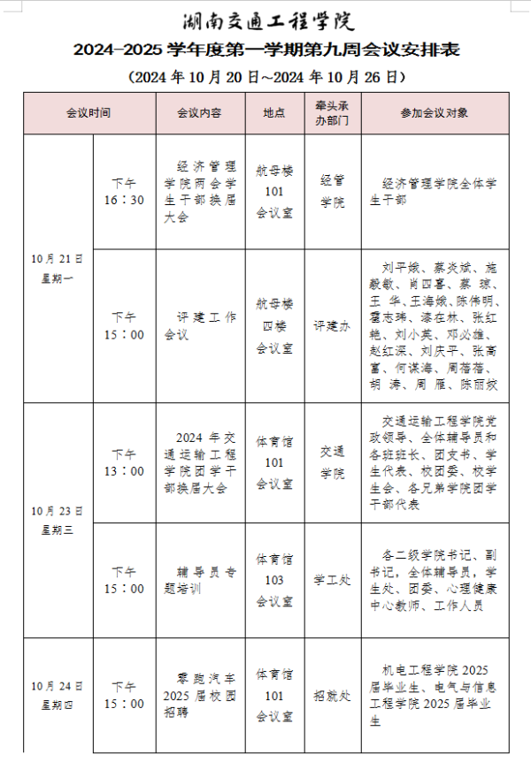 新葡萄8883官网AMG官网2024-2025学年度第一学期第十周会议安排表
