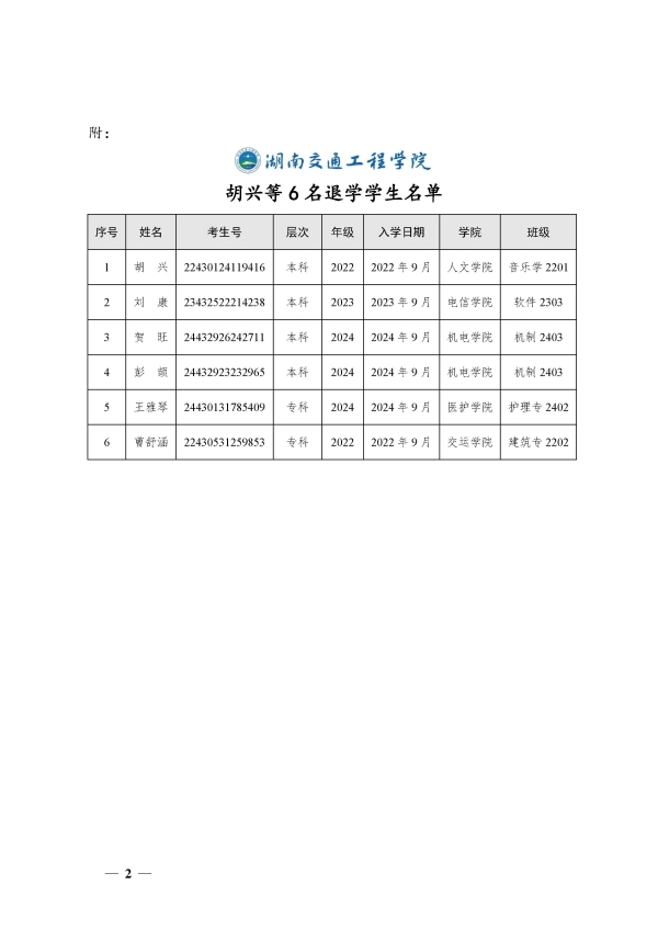 关于同意胡兴等6名同学退学的决定(湘交院学管〔2024〕28号)