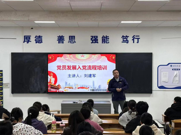 党总支副书记刘建军向同学们讲解了《党员发展流程》,围绕党性认识、入党动机和党员发挥先锋模范作用等方面与学生互动,号召同学们积极向党组织靠拢。