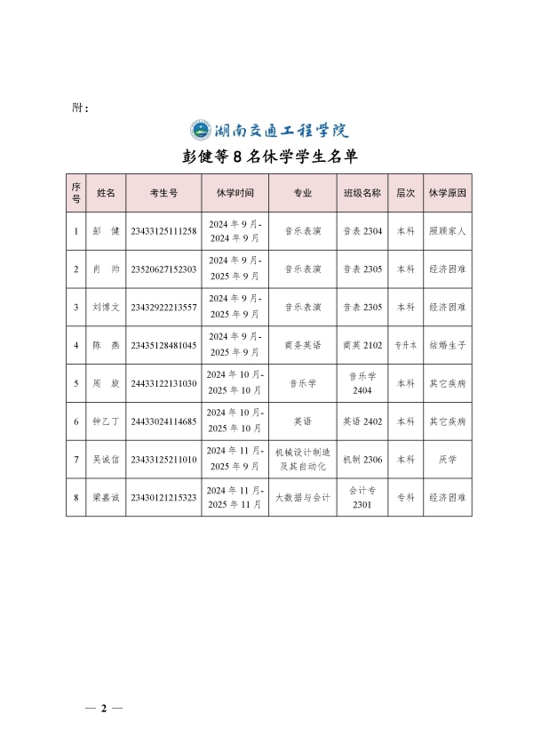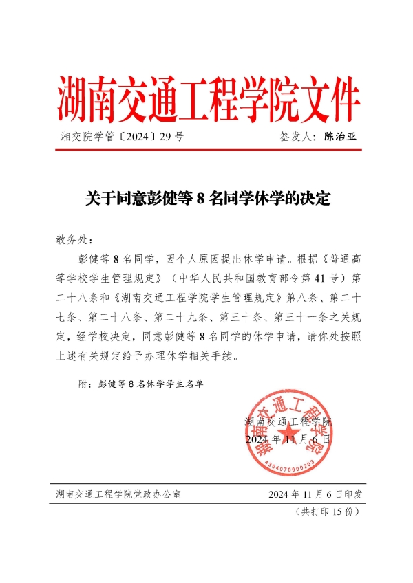 关于同意彭健等8名同学休学的决定(湘交院学管〔2024〕29号)
