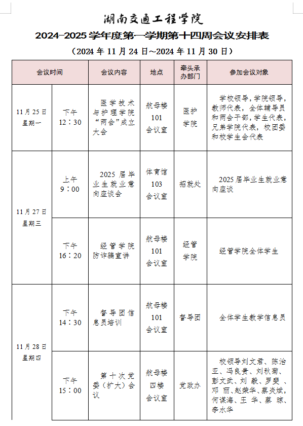 新葡萄8883官网AMG官网2024-2025学年度第一学期第十四周会议安排表