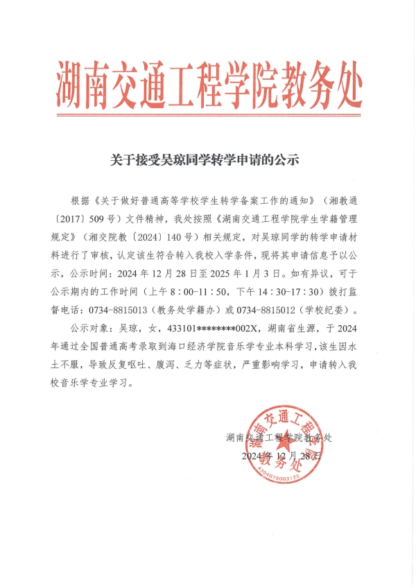 关于接受吴琼同学转学申请的公示