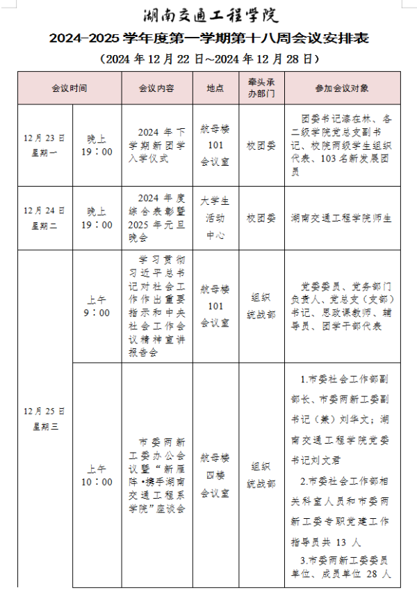 新葡萄8883官网AMG官网2024-2025学年度第一学期第十九周会议安排表