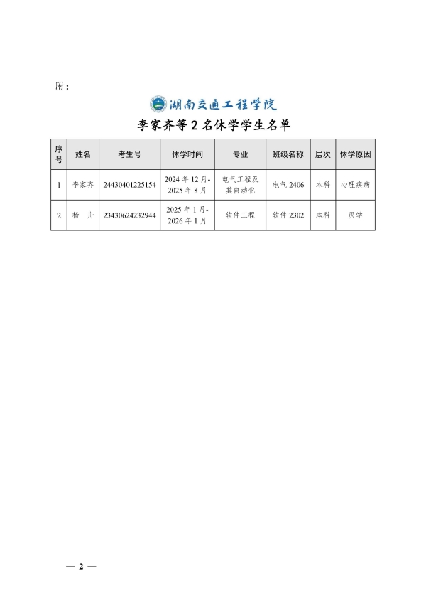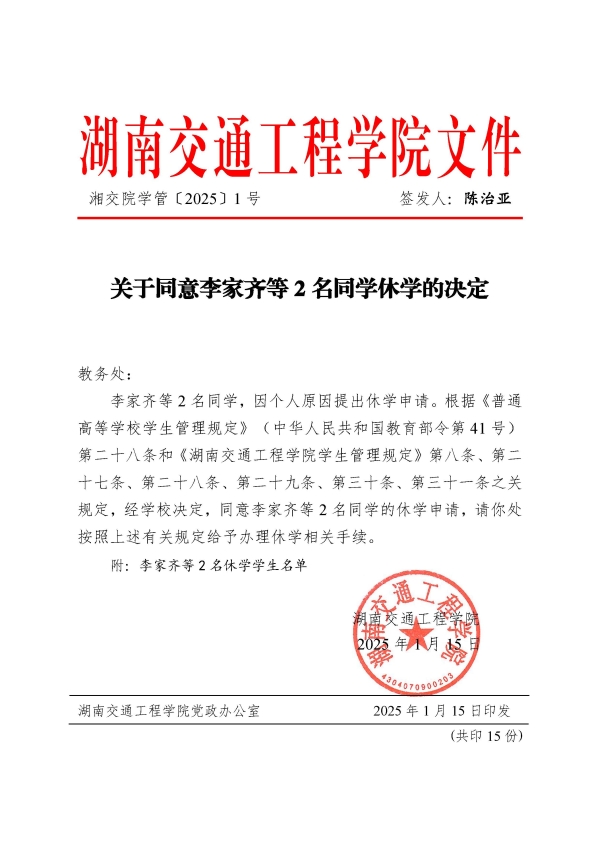 关于同意李家齐等2名同学休学的决定(湘交院学管〔2025〕1号)