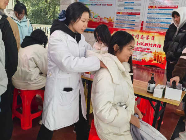雷锋日当天,志愿者们早早抵达现场,有序布置场地,为义诊做好准备工作。随着下课铃声响起,教学楼大厅渐渐热闹起来,过往的师生被义诊活动和志愿者们热情的招呼所吸引,纷纷驻足参与。义诊现场,志愿者们耐心引导师生们参与测量血压、检测视力等健康检查和推拿按摩、艾灸等中医特色服务。面对来往师生们的咨询,志愿者们耐心倾听,并根据每个人的身体状态提出科学合理的建议。