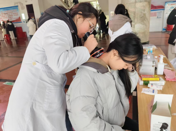 志愿者们早早抵达现场,有序地布置场地,为义诊做好准备工作。随着下课铃声响起,教学楼大厅渐渐热闹起来,来往的师生们被义诊活动志愿者们热情的招呼所吸引,纷纷驻足参与。在义诊现场,志愿者们充分展现出专业素养和奉献精神。他们耐心地引导师生们进行各项检查,有条不紊地为大家测量血压、检测视力、检查色盲及色弱。此外,还提供了推拿按摩、艾灸等中医特色服务。面对来往师生们的咨询,志愿者们总是耐心倾听,并根据每个人的身体状态提出实用的健康小常识和科学合理的建议,看着来往的师生们一张张笑脸,义诊活动的温暖一定传递到了他们的心里。