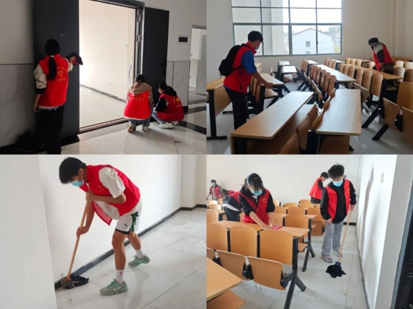 会议结束后,在何立权老师和学生负责人的带领下,入团积极分子们迅速投入到艺术楼的卫生清扫工作中。在负责人的安排下,同学们分工明确工作有序进行,有的负责地面清扫,有的负责桌椅墙门擦拭,有的……