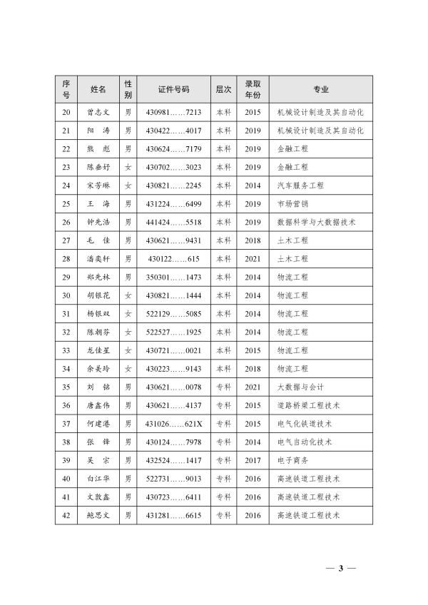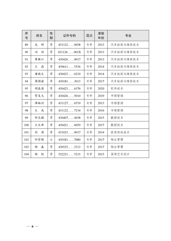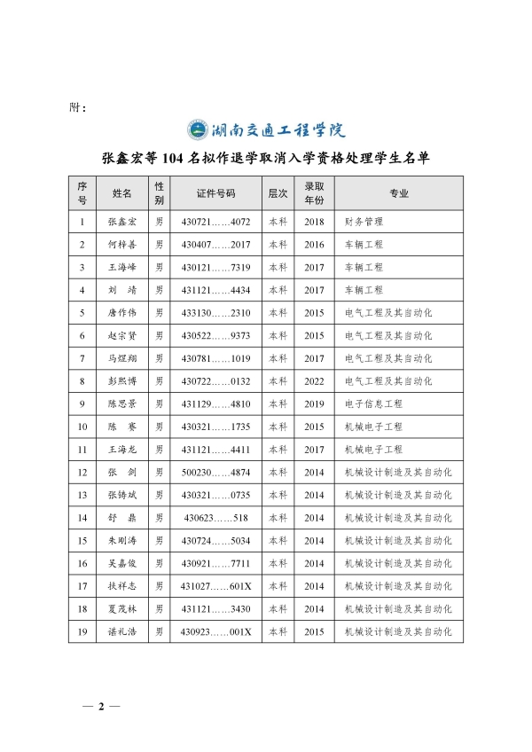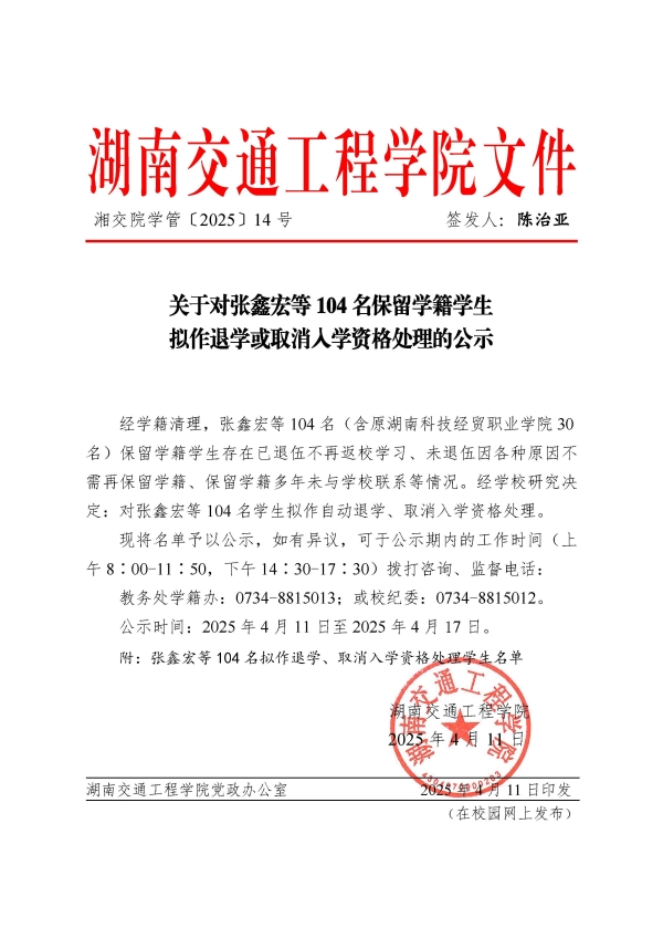 关于对张鑫宏等104名保留学籍学生拟作退学或取消入学资格处理的公示(湘交院学管〔2025〕14号)