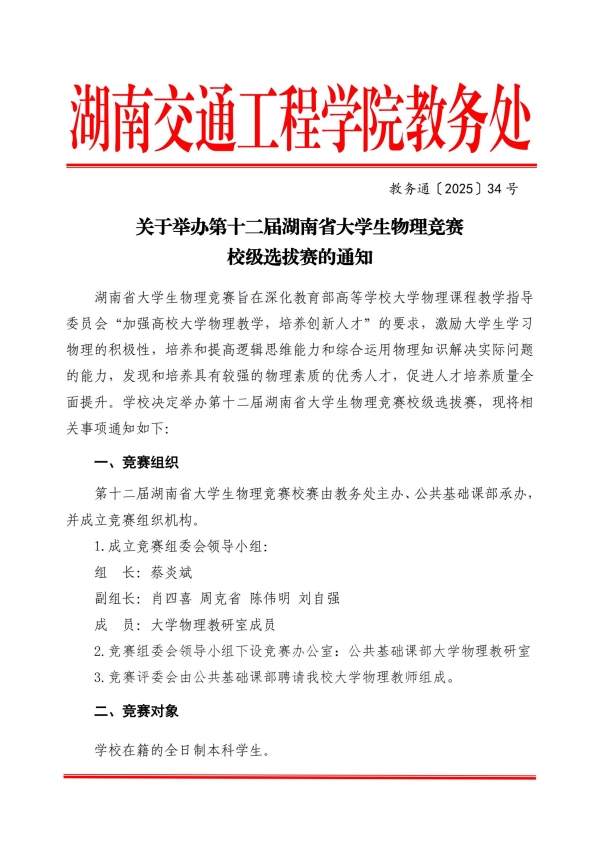 关于举办第十二届湖南省大学生物理竞赛校级选拔赛的通知