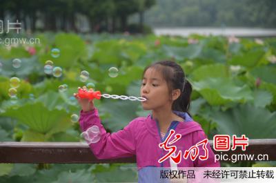 2019年6月30日,湖南衡阳市南郊公园内一望无际的美丽荷花引来了很多天真无邪的孩子,她们在园内心情玩耍,吹出五彩泡泡飞向荷池,也荷花相映成趣。