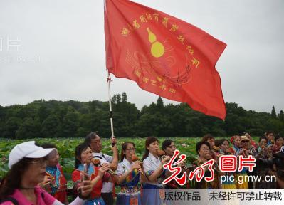 2019年6月30日,湖南衡阳市南郊公园内一望无际的美丽荷花引来了衡阳市葫芦丝爱好者,他们在吹奏《我和我的祖国》,向“七一”党的生日深情献礼。