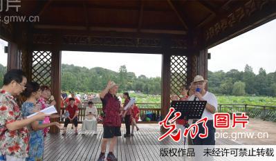 2019年6月30日,湖南衡阳市南郊公园内一望无际的美丽荷花引来了很多唱歌爱好者,他们在合唱《没有共产党就没有新中国》,向“七一”党的生日深情献礼。