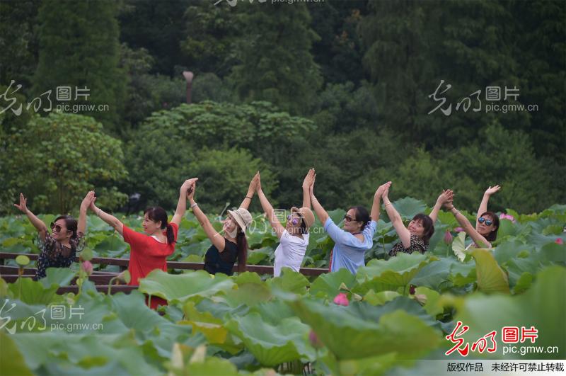 2019年6月30日,湖南衡阳市南郊公园内一望无际的美丽荷花引来了很多跳舞爱好者,他们和着《我们的生活充满阳光》的优美旋律载歌载舞。