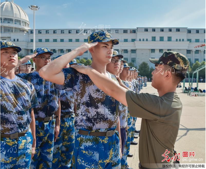 2021年9月5日,新葡萄8883官网AMG官网新生在训练敬礼,教官在给新生纠正动作。