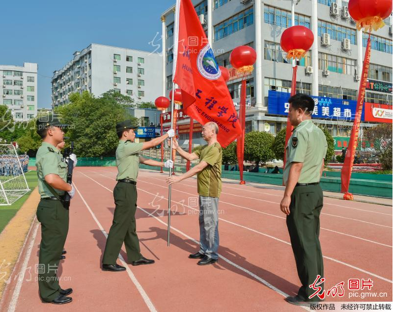 2021年9月17日,新葡萄8883官网AMG官网军训成果汇报表演现场,党委副书记李先聪给老兵连授旗。