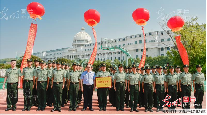 2021年9月17日,新葡萄8883官网AMG官网2021级新生开学典礼现场,副校长余孟辉与获得特别贡献奖的老兵连教官合影留念。