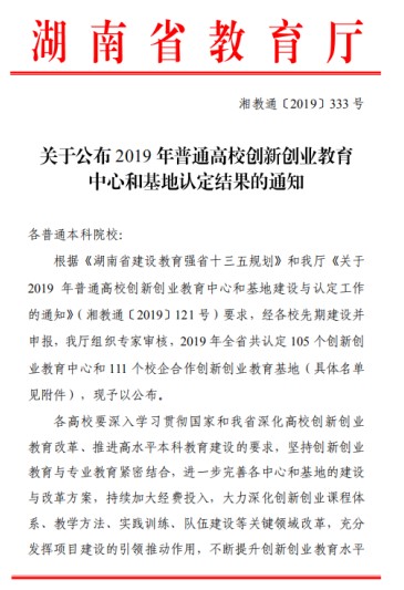 根据《湖南省建设教育强省十三五规划》和湖南省教育厅《关于2019年普通高校创新创业教育中心和基地建设与认定工作的通知》(湘教通[2019]121号),交通运输工程学院积极响应,经先期建设并申报,我院联合北京全路通信信号研究设计院集团有限公司申请的《交通类专业校企合作创新创业教育基地》获得湖南省教育厅的认定。