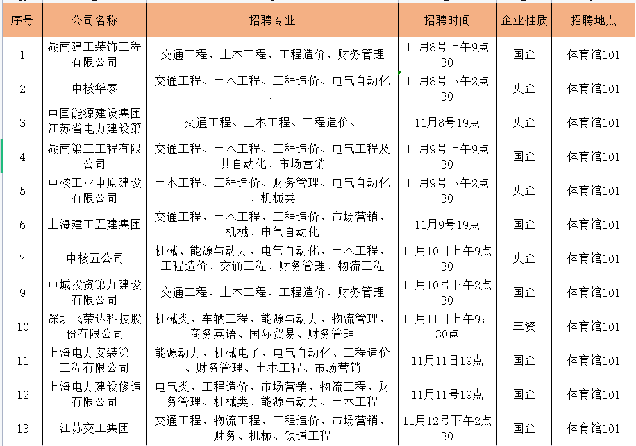下表是交通运输工程学院一周招聘、宣讲会安排(2021.11.08-2021.11.14)