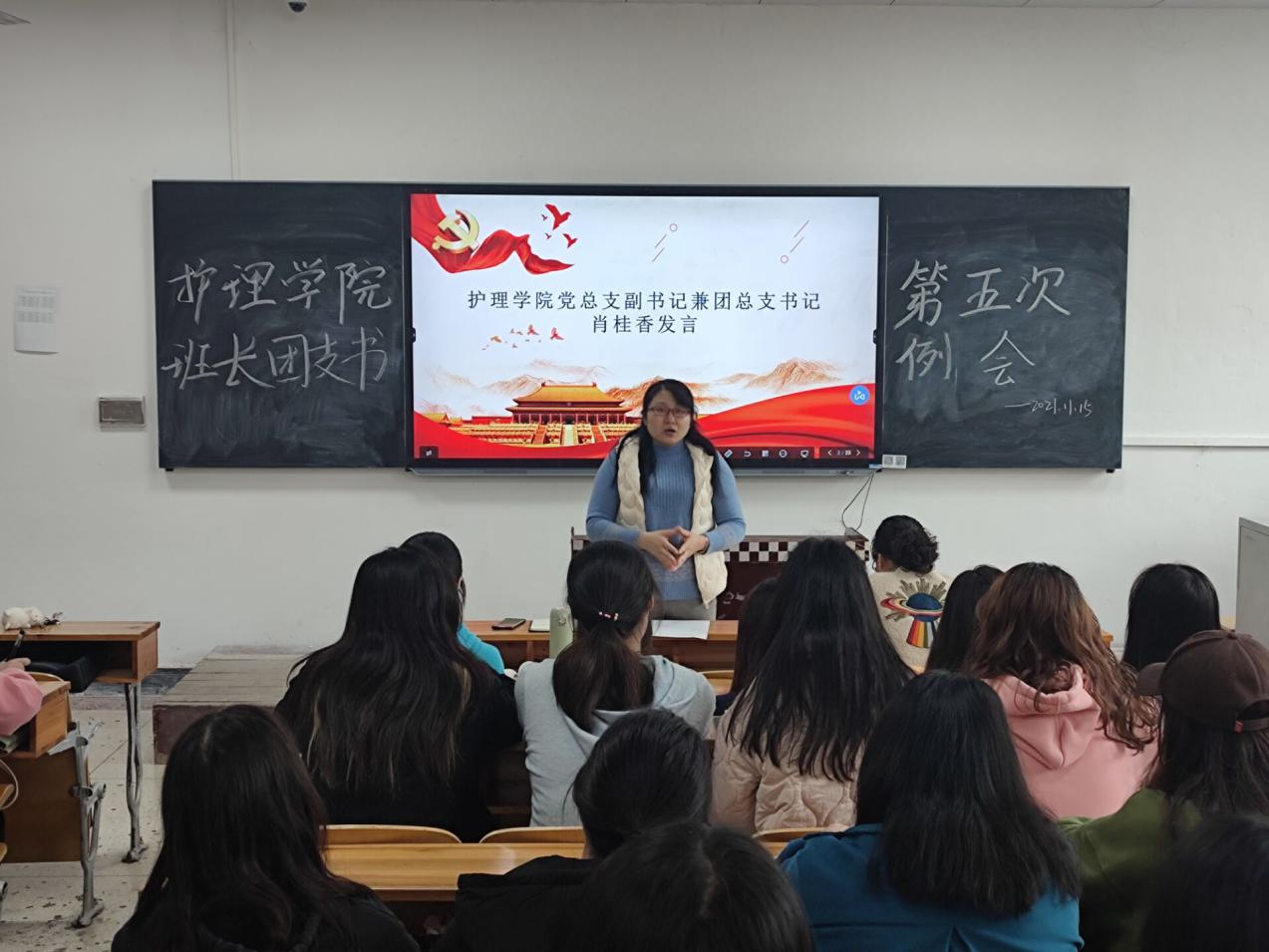 为进一步促进班级管理,护理学院于2021年11月15日中午12:10在教学楼201教室召开本学期第五次班长、团支书例会。出席本次会议的人员有:护理学院党总支书记邓丽,党总支副书记兼团总支书记肖桂香,学生干事老师陈文蓉,团总支、学生会主要干部以及各班班长和团支部书记。