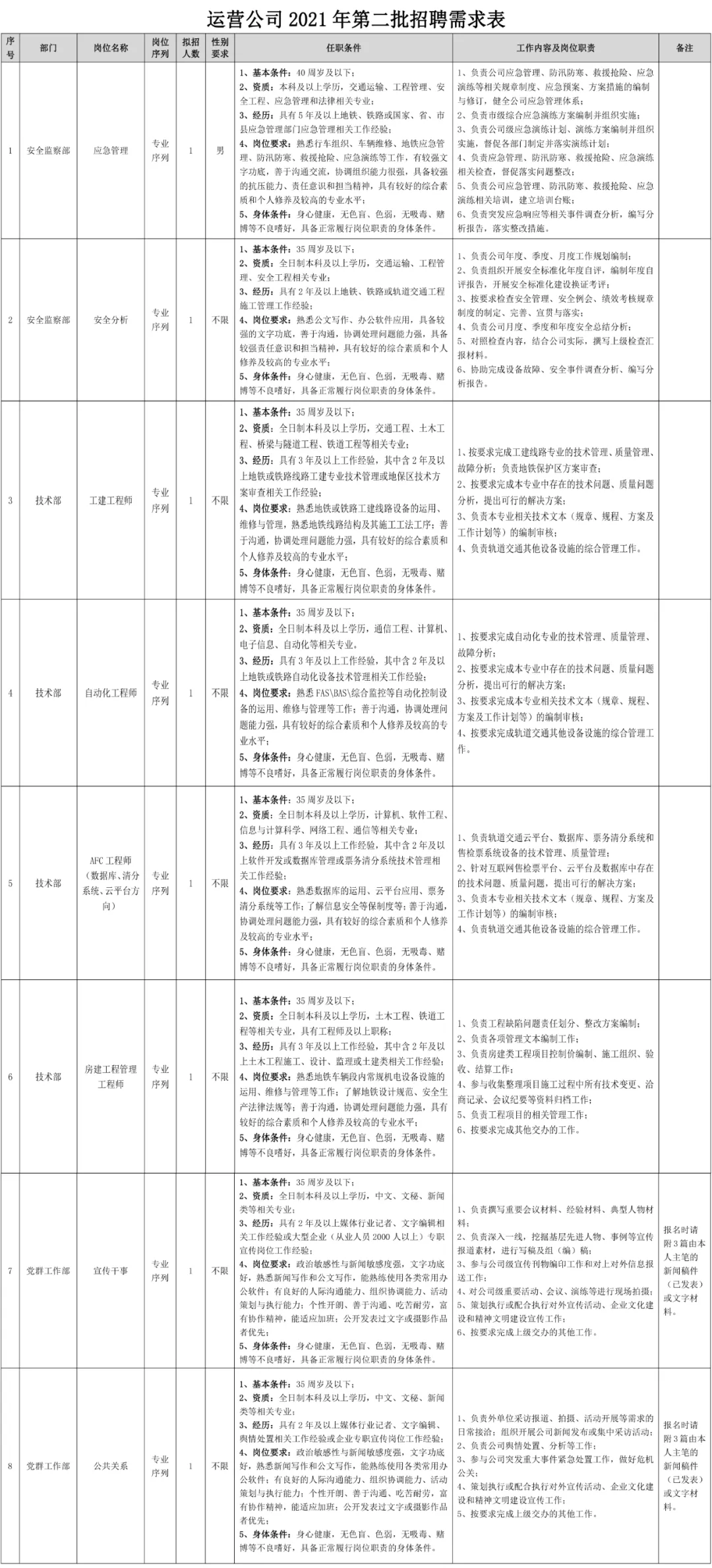 各岗位具体招聘条件详见附件:《运营公司2021年第二批招聘需求表》。