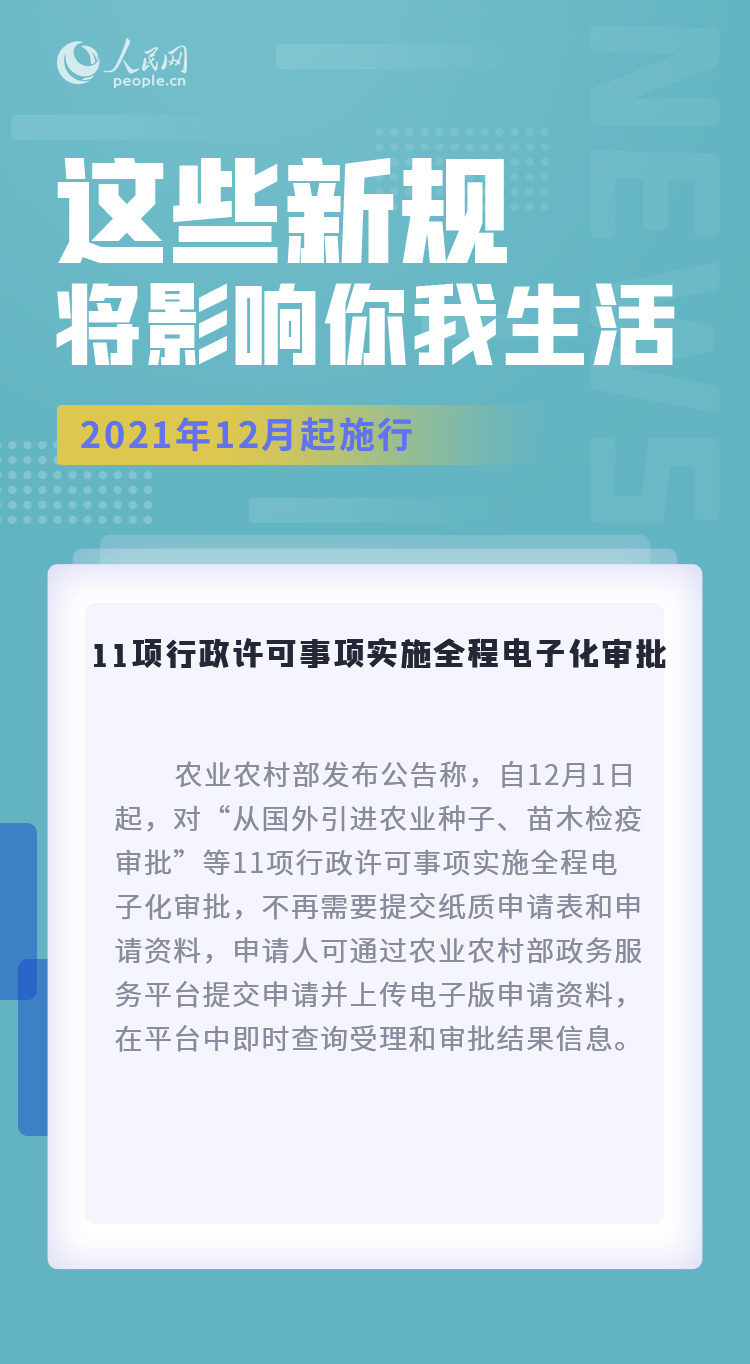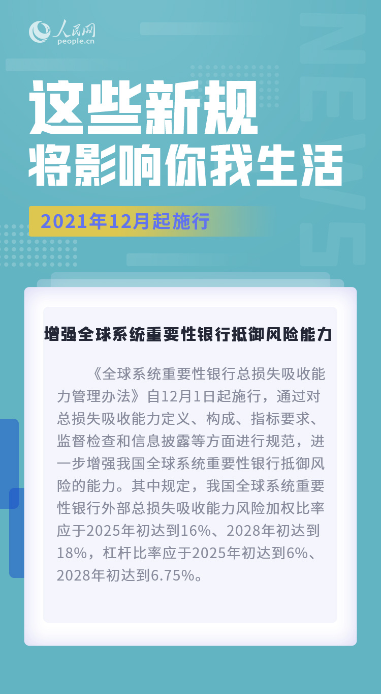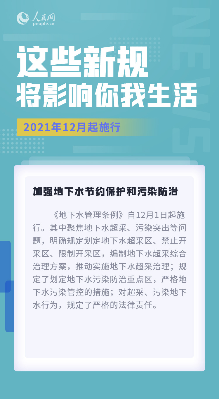 加强地下水节约保护和污染防治,增强我国全球系统重要性银行抵御风险能力,11项行政许可事项实施全程电子化审批……12月,这些新规将影响你我生活。