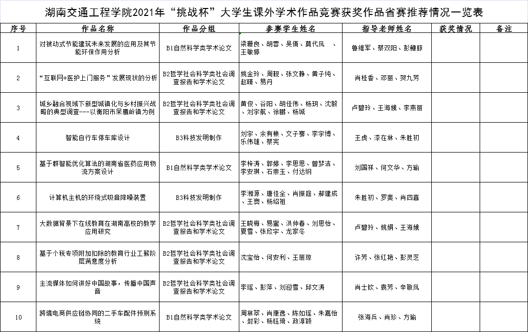 新葡萄2020年“挑战杯”大学生课外学术作品竞赛已落下帷幕。作品经过院内初赛、校级书面评审和终审决赛,共评出36件获奖作品,金奖作品6件,银奖作品12件,铜奖作品18件。同时,根据2021 年“挑战杯”湖南省大学生课 外学术作品竞赛规则和评审要求,拟推荐其中10件参赛作品参加湖南省竞赛,现将获奖作品名单(排名不分先后)及省赛推荐情况予以公示。
