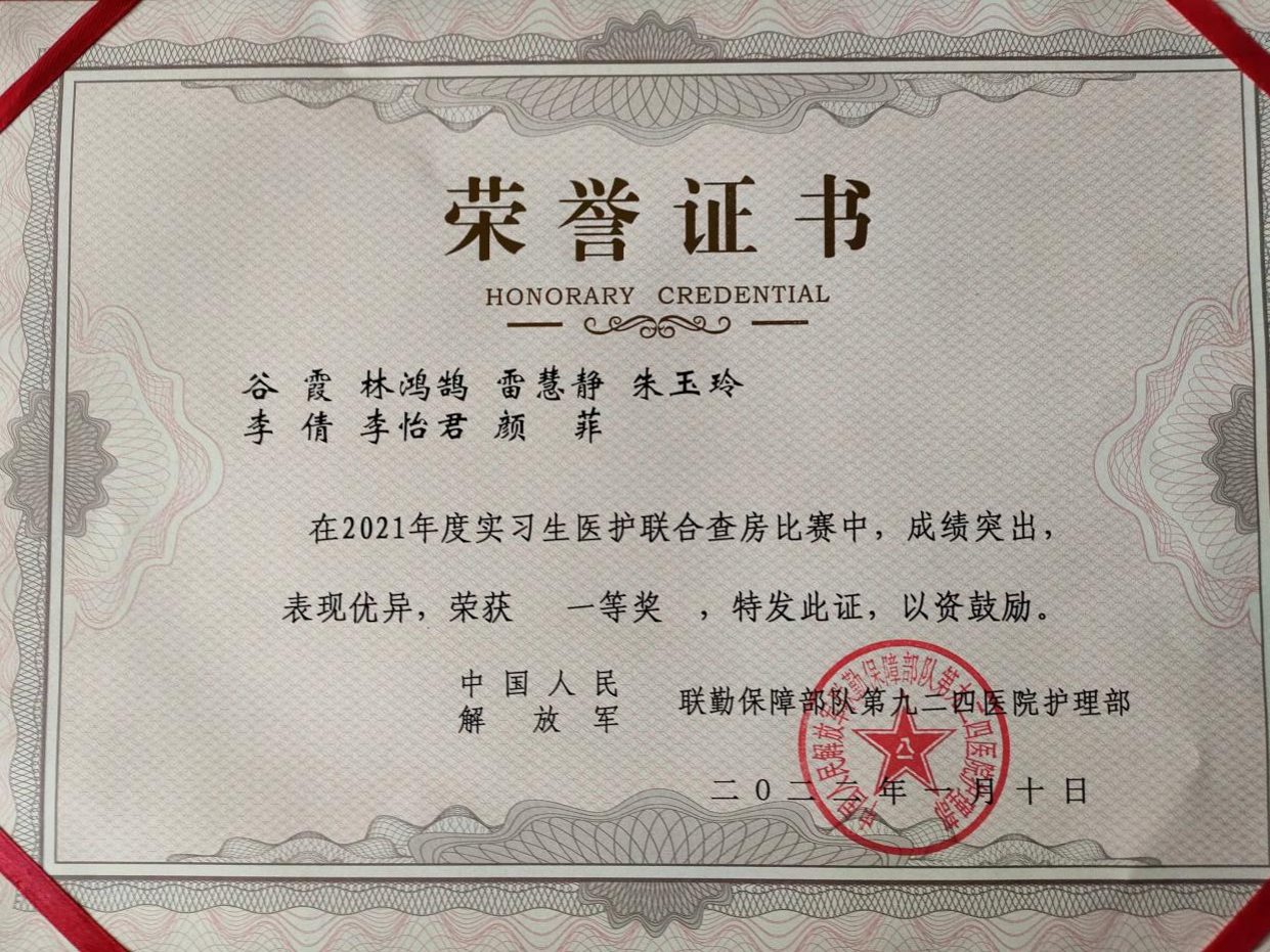 2022年1月10日解放军联勤保障部队第九二四医院在医院学术厅举办实习生医护联合查房比赛,新葡萄实习生参赛团队在激烈角逐比赛中荣获一等奖