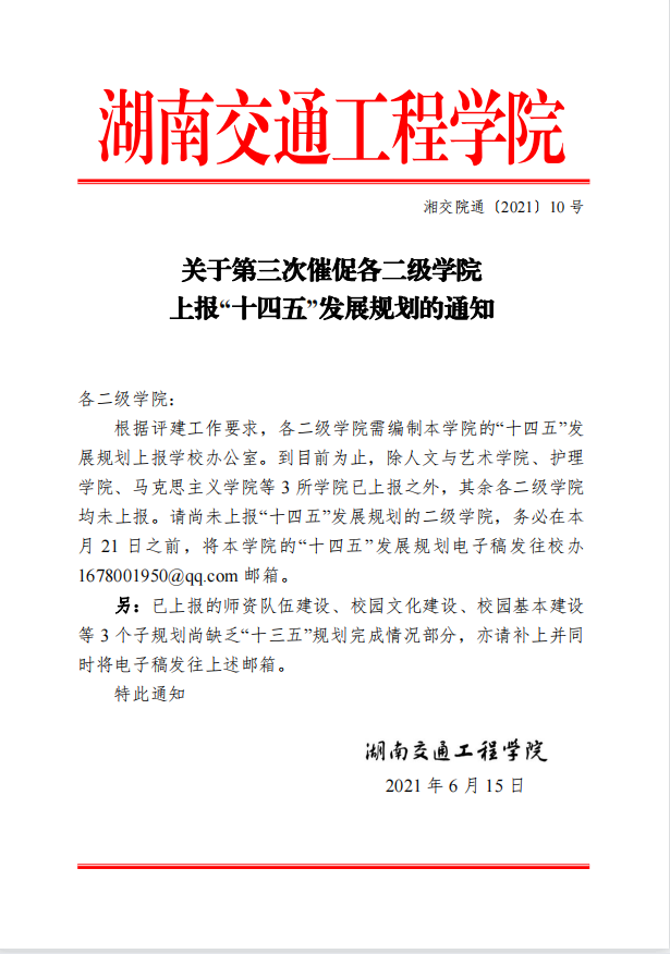 关于第三次催促各二级学院上报“十四五”发展规划的通知